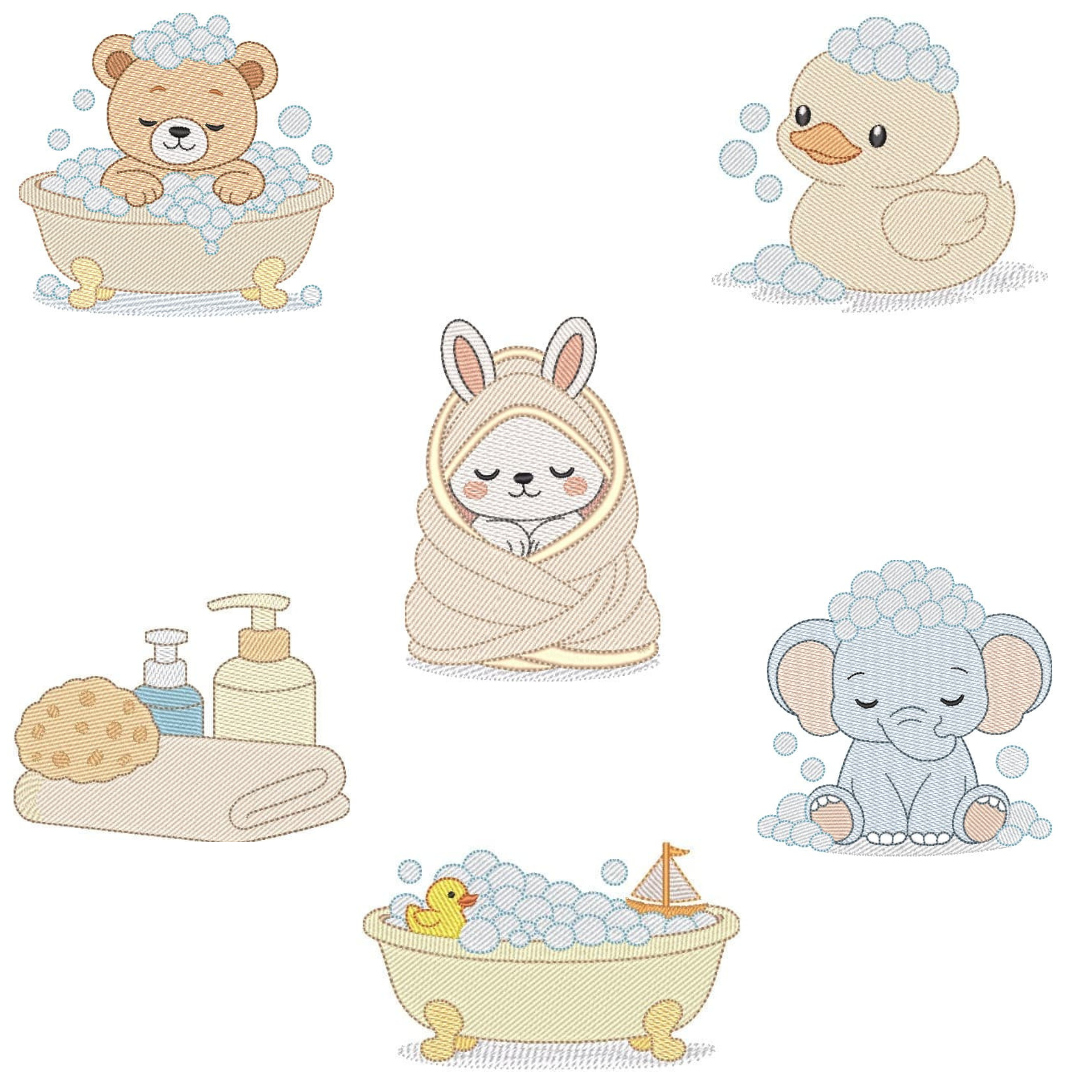 Coleção com 06 matriz Hora do Banho5 (Pontos Leves) , matrizes de bordados é um produto virtual, desenvolvidas em pontos leves e detalhes em pontos cheio, compatíveis com vários modelos de máquinas, PES – JEF – EXP – XXX – DST,  Ideal para bordar em variados tipos de peças. A liberação das matrizes ocorre automaticamente após a confirmação do pagamento, basta acessar a área de cliente aqui no site e ir na aba de downloads,