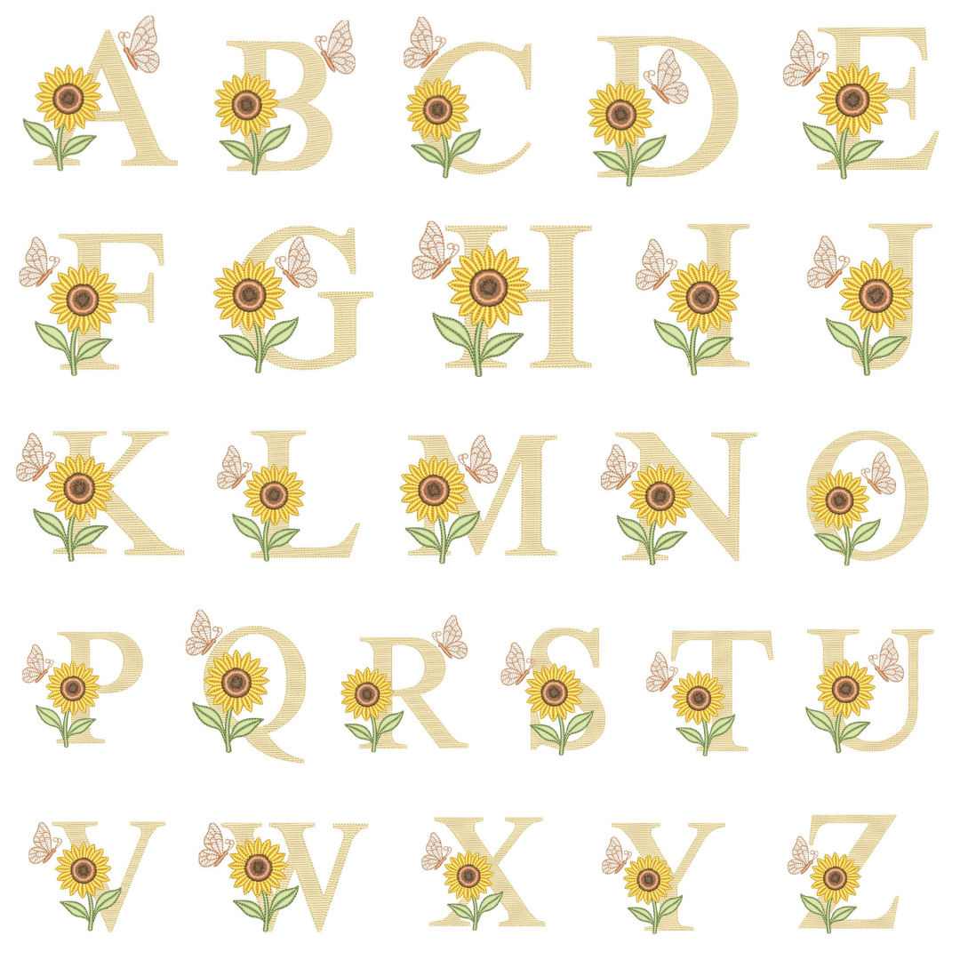 Coleção de Matriz de Alfabetos Monogramas com Girassol , matrizes de bordados é um produto virtual, desenvolvidas em pontos leves e detalhes em pontos cheio, compatíveis com vários modelos de máquinas, PES – JEF – EXP – XXX – DST,  Ideal para bordar em variados tipos de peças. A liberação das matrizes ocorre automaticamente após a confirmação do pagamento, basta acessar a área de cliente aqui no site e ir na aba de downloads,