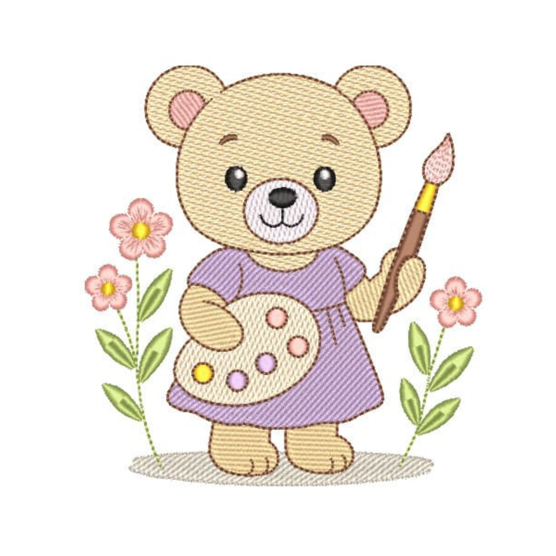Ursinha Pintora, matrizes de bordados é um produto virtual, desenvolvidas em pontos leves e detalhes em pontos cheio, compatíveis com vários modelos de máquinas, PES – JEF – EXP – XXX – DST,  Ideal para bordar em variados tipos de peças. A liberação das matrizes ocorre automaticamente após a confirmação do pagamento, basta acessar a área de cliente aqui no site e ir na aba de downloads,